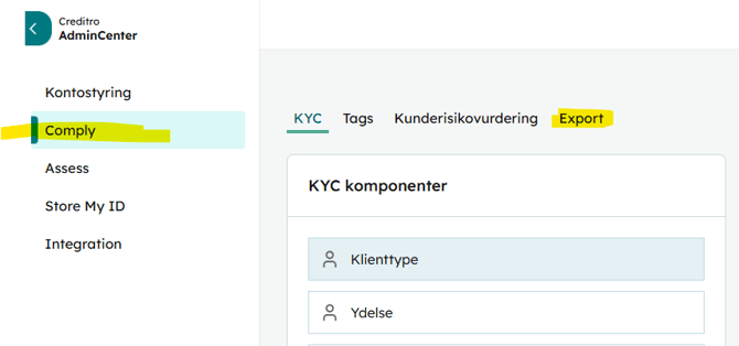 Hvis I har tilkøbt adgang til funktionen AML-export, har I mulighed for at kunne trække en fuld liste over jeres sager. Dette gør I nede i indstillingerne, som I finder ved at trykke på tandhjulet nederst ude i venstre kolonne. Herefter vælge du "Comply" og herefter "Export". Husk det kræver admin-rettigheder for at have adgang til indstillingerne.
